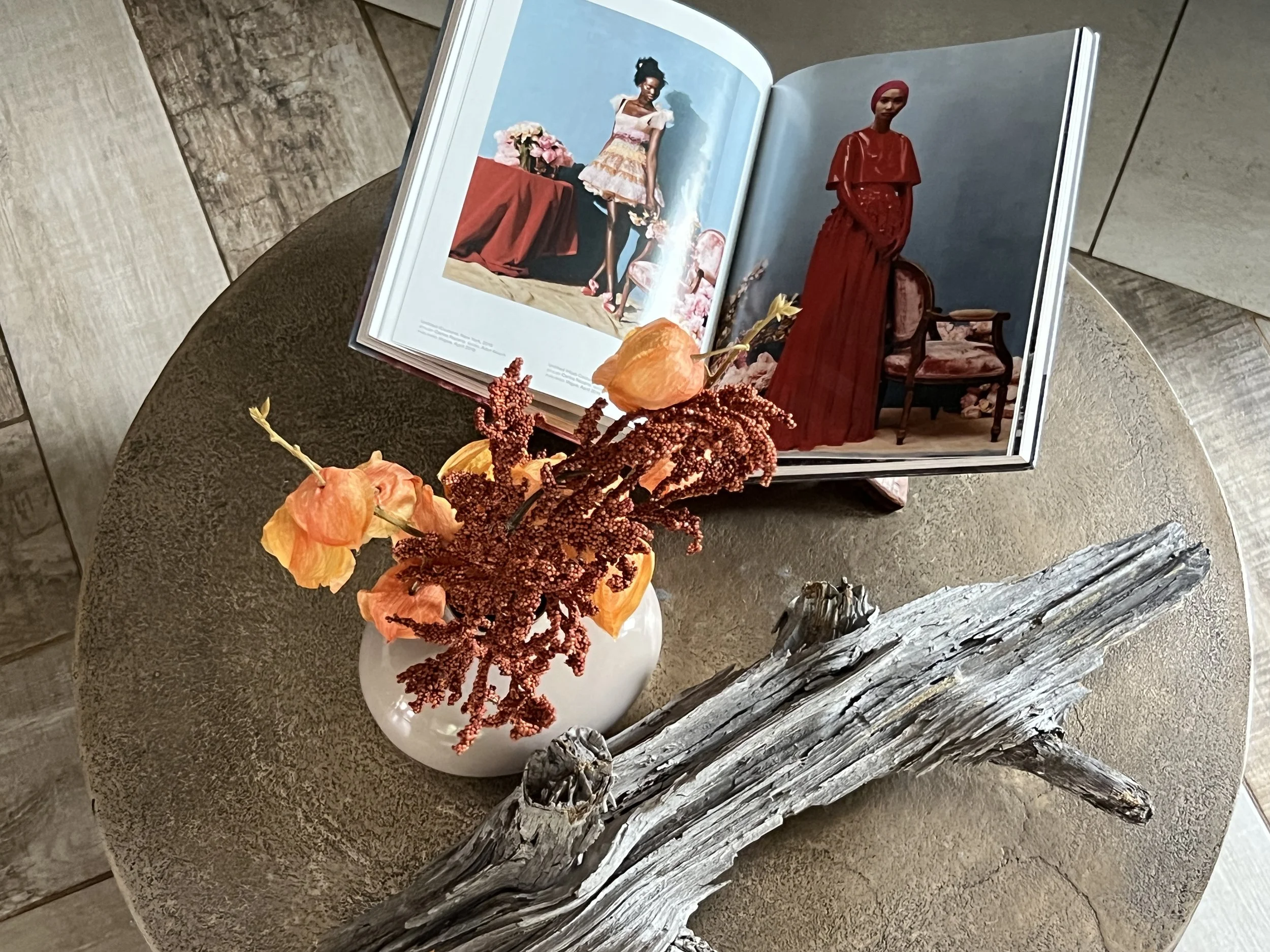 This fall, it’s all touch and tenderness: velvet, linen, knit, and driftwood. The driftwood I collected while on a hike at Arabia Mountain sits beside a vase of papery orange blooms and an open art book perfectly imperfect, a reminder that even objects can practice composure.